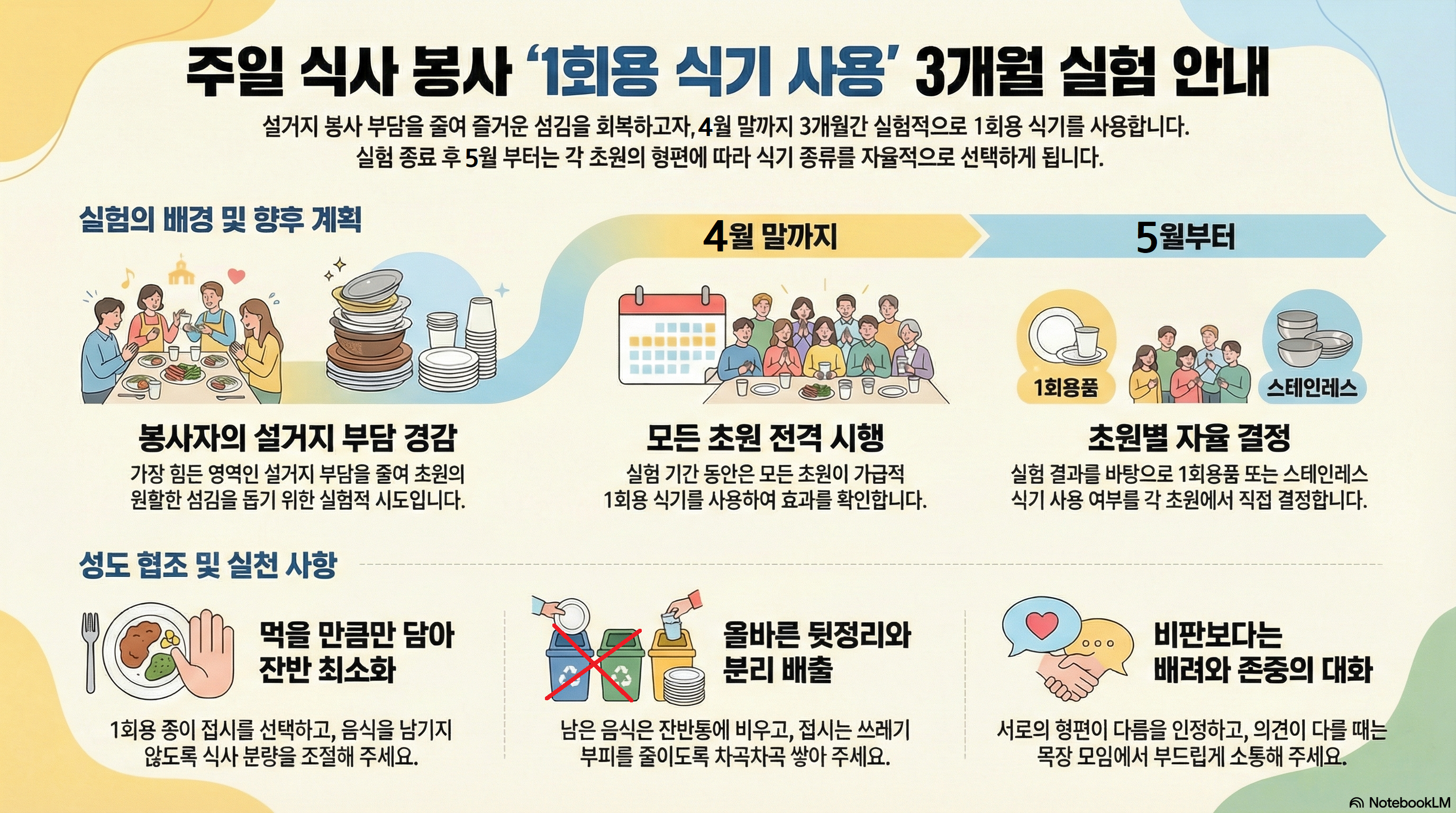 4. 1회용 식기 사용은 실험적으로 하는 것이니, 혹시 마음이 불편하시더라도 그리고 즐겁게 설거지하며 봉사할 수 있는 초원에서도 4월 말까지는 가급적 모든 초원에서 1회용 식기를 사용해 주시기 바랍니다.