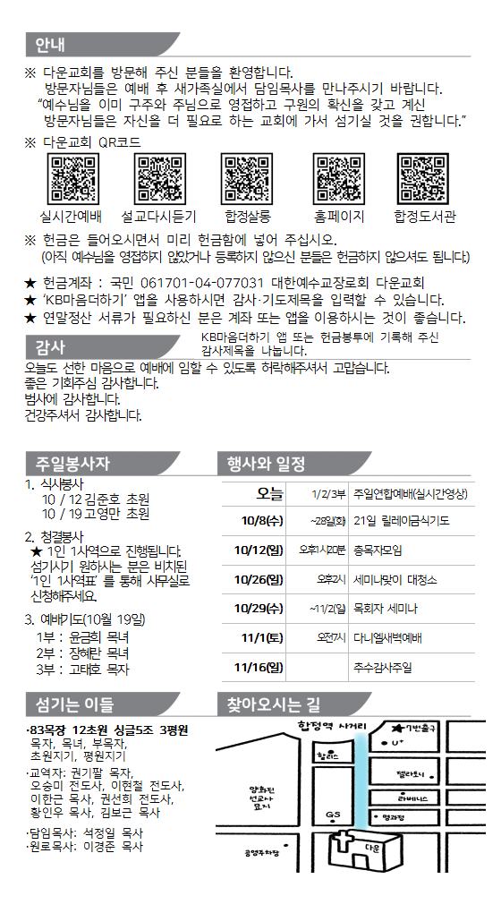 * 교회주보는 큐알코드로 이용하실 수 있습니다. 본당입구, 본당 접이식테이블, 주보에 있는 “다운교회 QR코드”와 다운교회 홈페이지 나눔터에 있는 “주보와 교회소식”에서 확인할 수 있습니다.