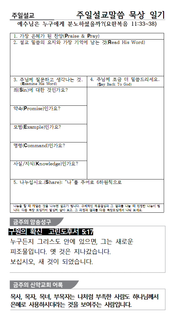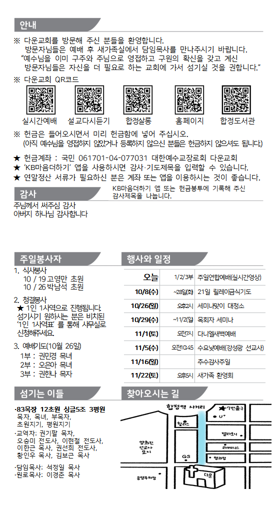 * 예배시간 10분 전에는 도착해서 기도로 준비해 주시고, 설교본문과 목회편지도 미리 읽어보시기 바랍니다.