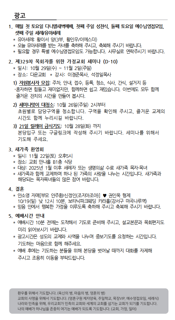 * 광고시간은 성도의 교제와 사역을 나누며 중보기도를 요청하는 시간입니다. 기도하는 마음으로 함께 해주세요.