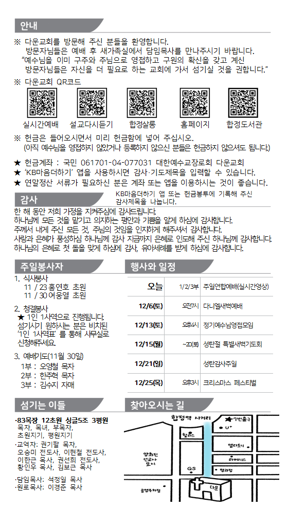 1. 매월 첫 토요일 다니엘새벽예배, 첫째 주일 성찬식, 둘째 토요일 예수님영접모임, 셋째 주일 세례/유아세례