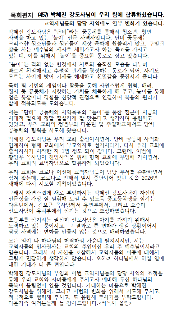 * 박혜진 강도사가 12월부터 청소년부 사역자로 부임합니다.