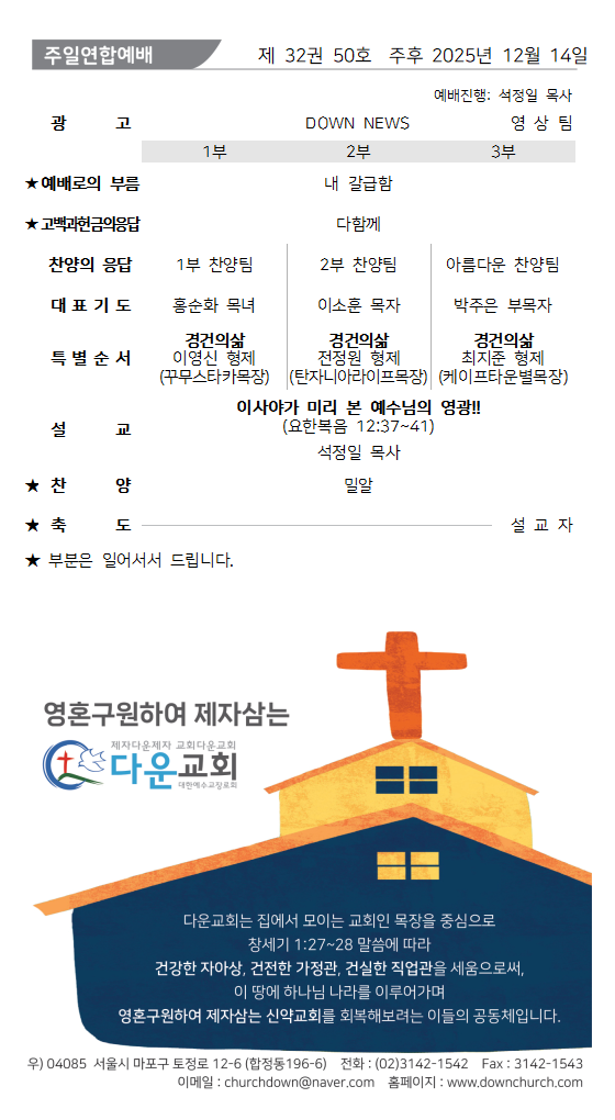 * 다음주는 성탄감사주일입니다. 우리를 위해 이 땅에 오신 예수님을 생각하며 기쁨과 감사의 마음으로 온 가족이 함께 참여해 주시기 바랍니다.