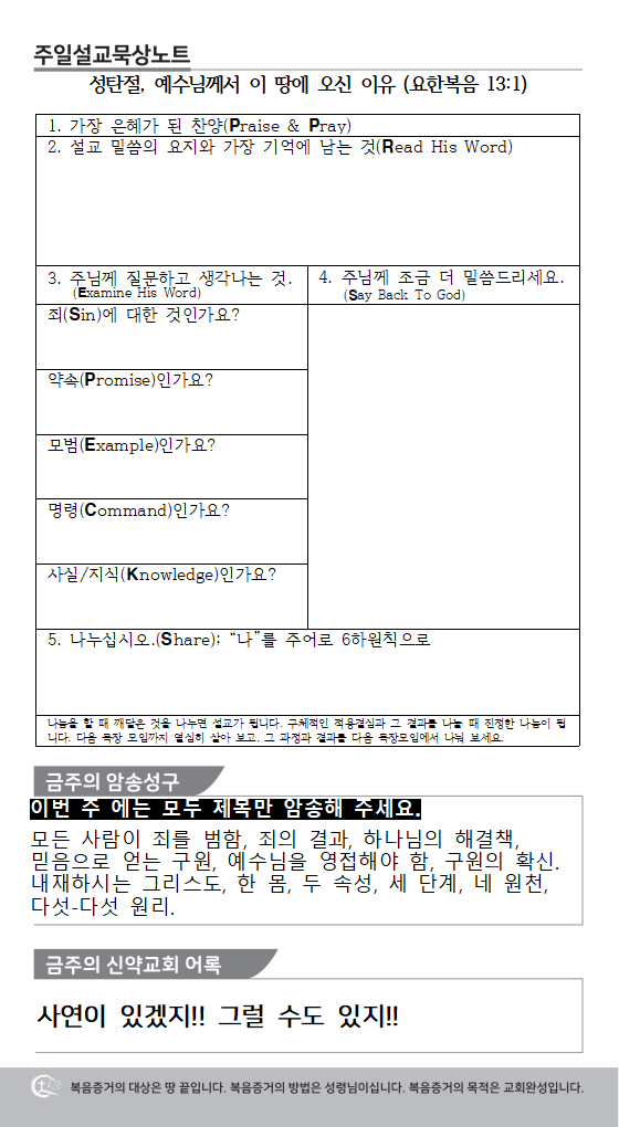 * 말씀노트와 불평제로 밴드는 목자/목녀님을 통해서 무료로 배부하며, 이후에는