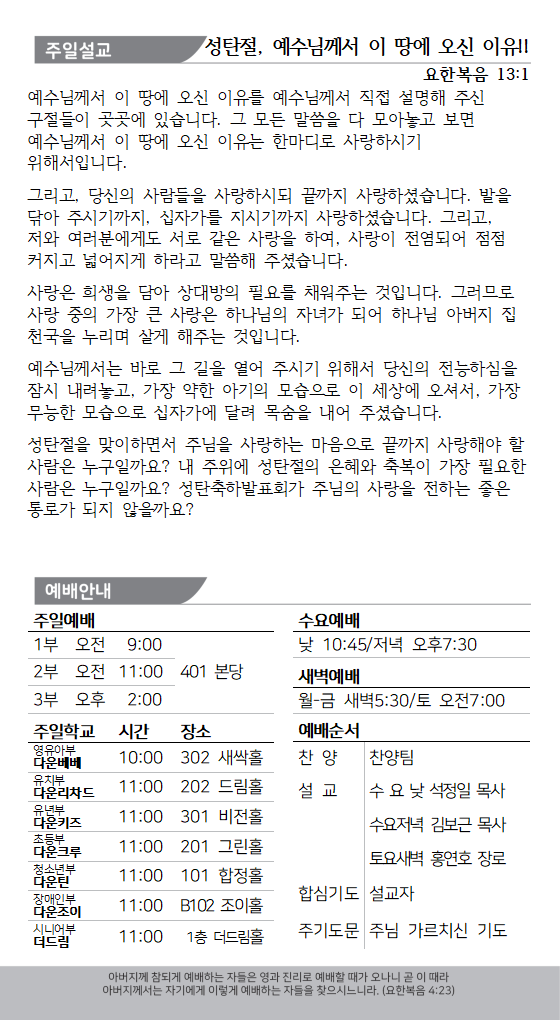 * 오늘은 성탄감사주일입니다. 우릴 위해 이 땅에 오신 예수님을 생각하며 기쁨과 감사의 마음으로 온 가족이 함께 참여해 주시기 바랍니다.