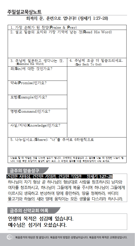 * 말씀노트와 불평제로 밴드는 목자/목녀님을 통해서 무료로 배부하며, 이후에는