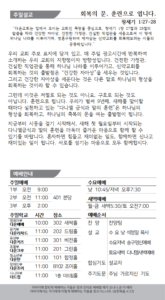 * 이번주 토요일 오전7시 다니엘새벽예배가 있습니다. 설교는 이한근 목사(조이부)입니다.