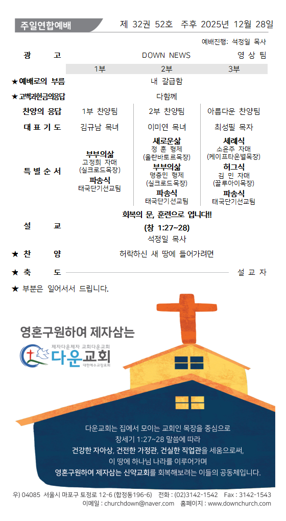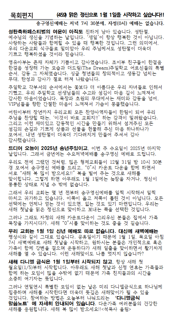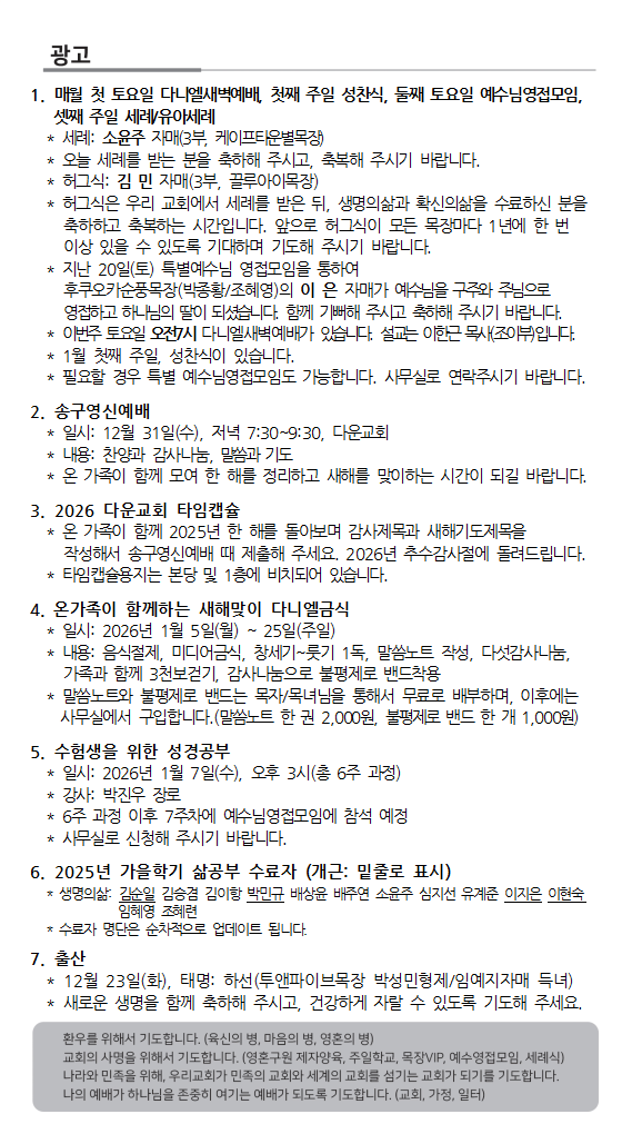 * 온 가족이 함께 2025년 한 해를 돌아보며 감사제목과 새해기도제목을 작성해서 송구영신예배 때 제출해 주세요. 2026년 추수감사절에 돌려드립니다.
