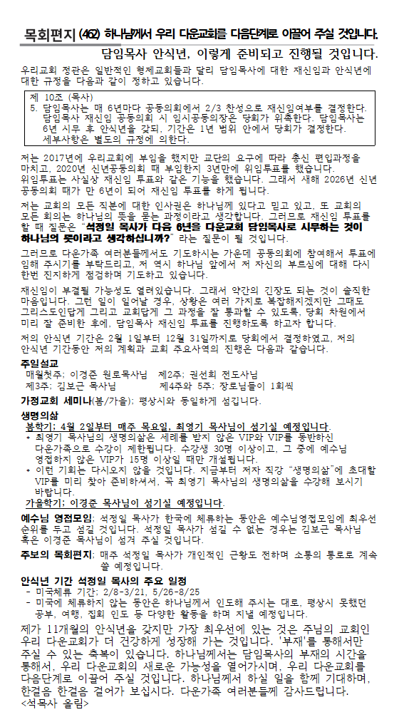 다음 주일은 세례, 유아세례가 있습니다. 원하시는 분들은 헌신석에 나오셔서 신청해 주시거나, 목자를 통해 교회사무실로 연락해 주시기 바랍니다.