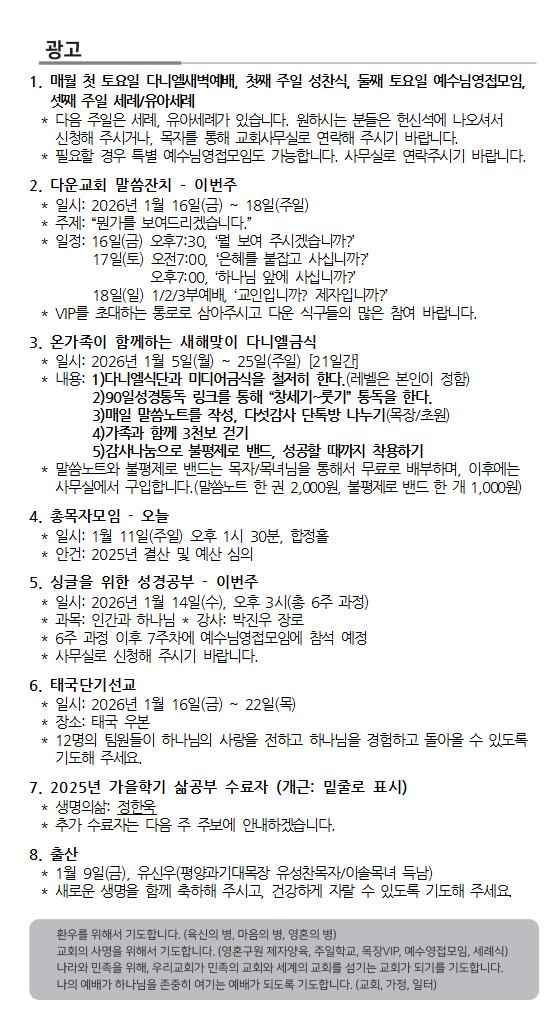 일시: 2026년 1월 5일(월) ~ 25일(주일) [21일간]
