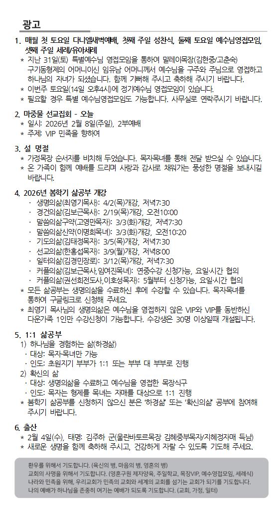 1. 매월 첫 토요일 다니엘새벽예배, 첫째 주일 성찬식, 둘째 토요일 예수님영접모임, 셋째 주일 세례/유아세례