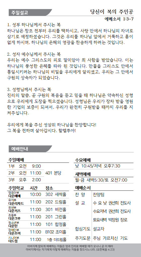 가정목장 순서지를 비치해 두었습니다. 목자목녀를 통해 전달 받으실 수 있습니다.