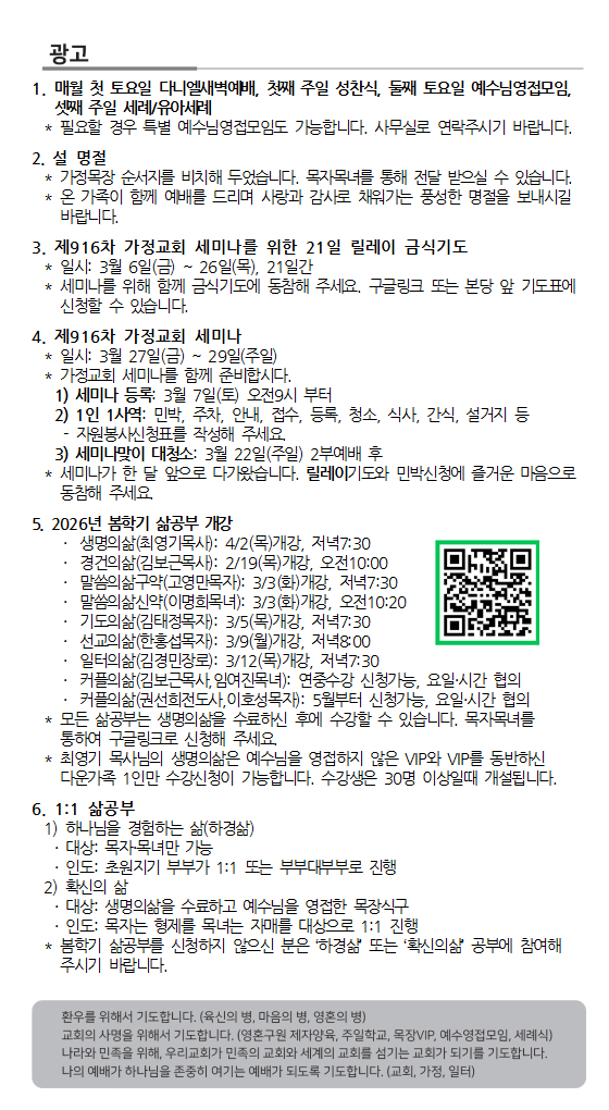 봄학기 삶공부를 신청하지 않으신 분은 하경삶또는 확신의삶공부에 참여해 주시기 바랍니다.