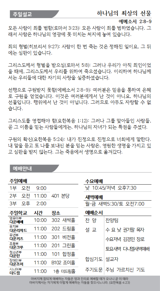 교회주보가 필요한 분들은 입장하면서 받으셨다가, 다시 회수함에 넣어주시면 주보를 재사용 할 수 있습니다.