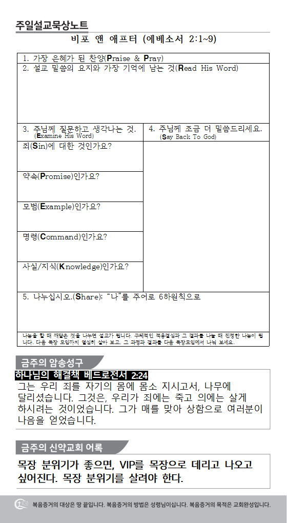 주일설교묵상 용지를 별지로 준비하여 비치해 두었습니다. 주일설교를 한 번 더 듣고 묵상일기를 작성하여 한 주간 살아본 삶의 간증을 목장모임에서 나눠 보시기 바랍니다.