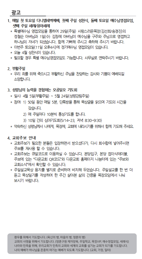 교회주보는 큐알코드로 이용하실 수 있습니다. 본당입구, 본당 접이식테이블, 주보에 있는 “다운교회 QR코드”와 다운교회 홈페이지 나눔터에 있는 “주보와 교회소식”에서 확인할 수 있습니다.