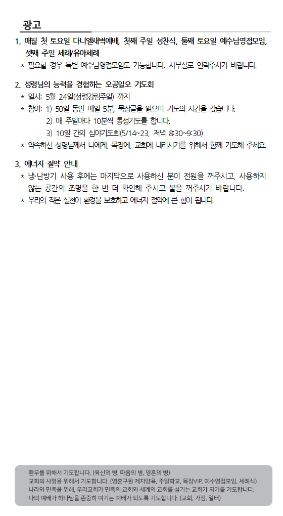 약속하신 성령님께서 나에게, 목장에, 교회에 내리시기를 위해서 함께 기도해 주세요.