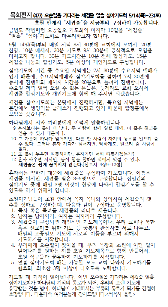 3) 10일 간의 심야기도회(5/14~23, 저녁 8:30~9:30)