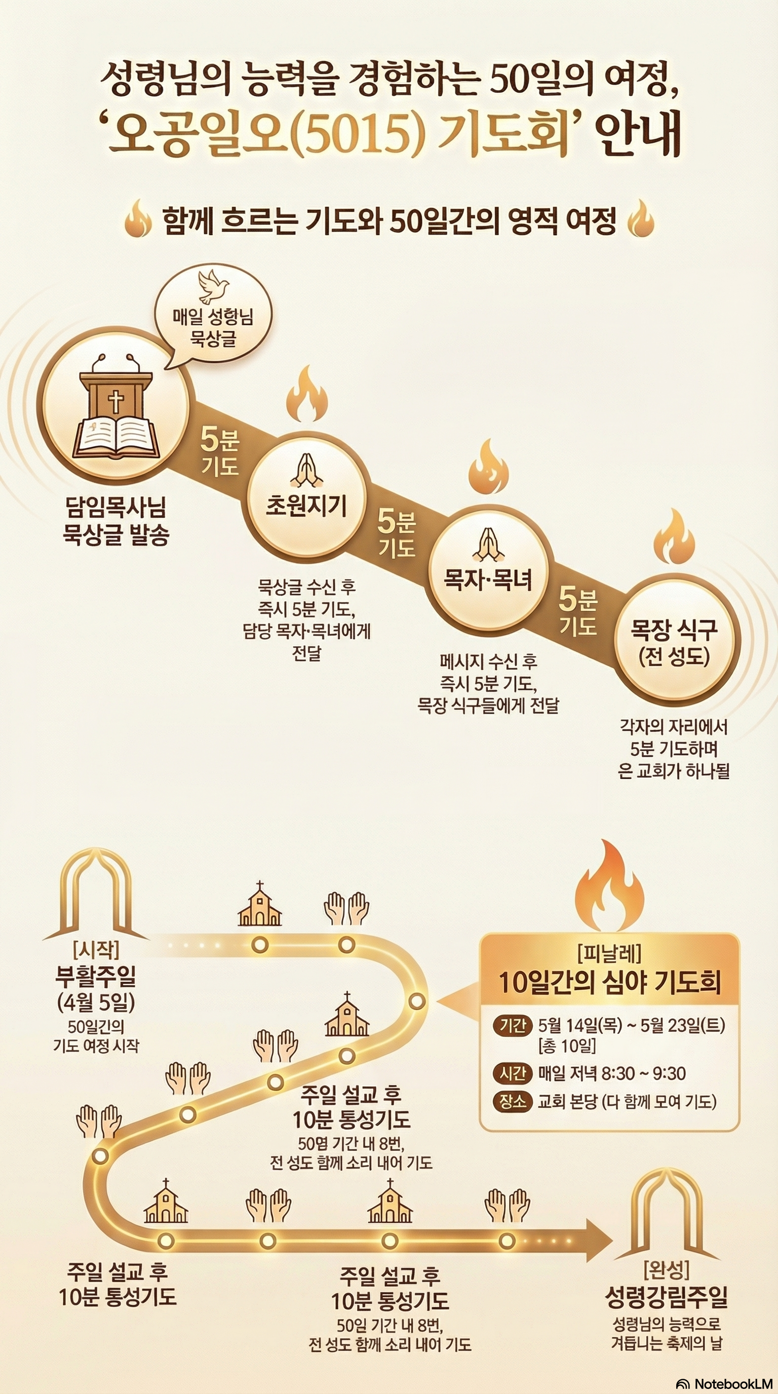 “오공일오” 기도는 이 50일 동안, 하루(1일)에 5분씩 약속하신 성령님께서 나에게, 우리 목장에, 우리 교회에 내리시기를 간구하는 기도입니다. 오늘 부터 제가 매일 초원지기님들의 단톡방에 성령님에 대한 짧은 묵상글을 보내드릴 것입니다. 초원지기님들께서는 받는 즉시 5분 기도의 시간을 가져주신 후에, 초원의 목자 목녀님들께 전달해 주시고, 목자 목녀님들은 받는 즉시 5분 기도의 시간을 가져주신 후에 목장 식구들에게 전달해 주시기 바랍니다.