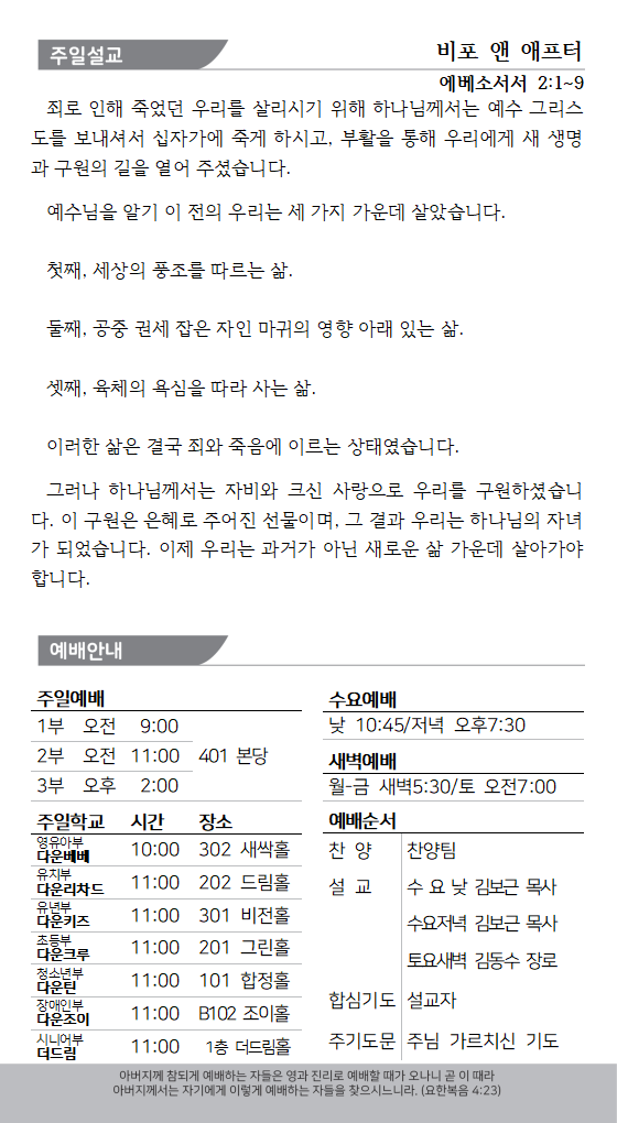 교회주보가 필요한 분들은 입장하면서 받으셨다가, 다시 회수함에 넣어주시면 주보를 재사용 할 수 있습니다.