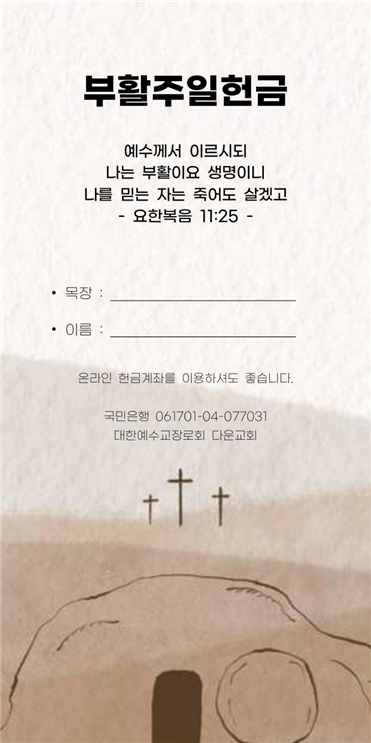 우리 죄를 위해 죽으시고 부활하신 주님을 찬양하는 감사와 기쁨의 예배되길 소망합니다.
