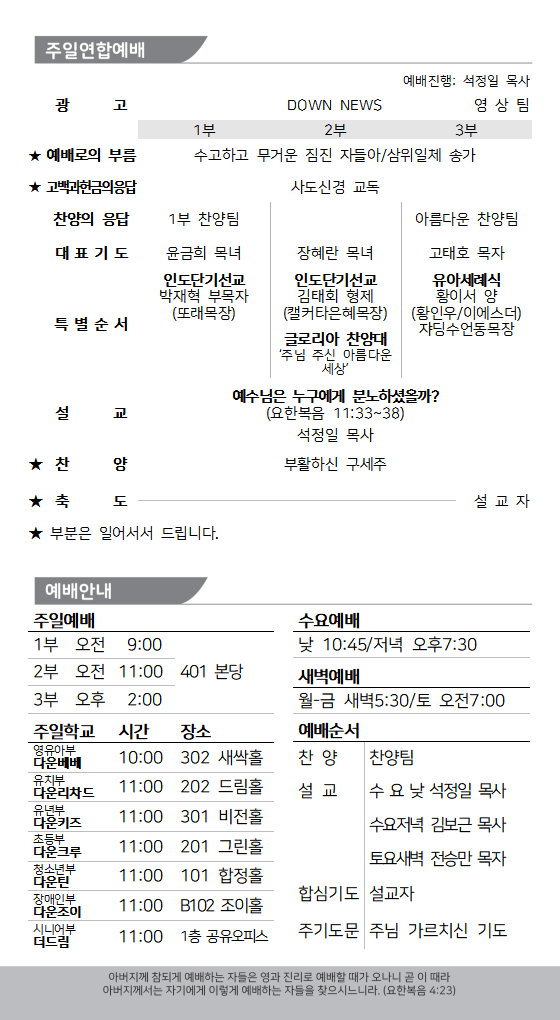 * 예배시간 10분 전에는 도착해서 기도로 준비해 주시고, 설교본문과 목회편지도 미리 읽어보시기 바랍니다.