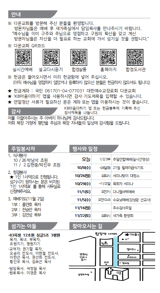 * 다음주 11월 2일, 1부/2부예배 참석하시는 분들은 세미나 참가자들을 위해 인근 공영주차장을 적극 이용해 주시기 바랍니다.
