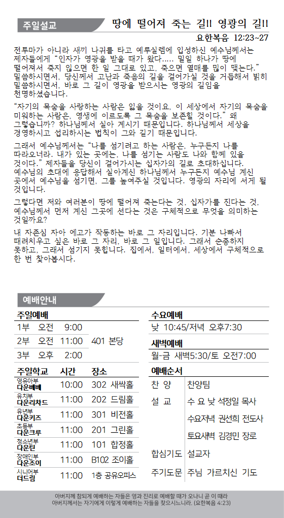 * 예배당은 모두가 함께 쓰는 공간입니다. 물 외에 커피나 음식물을 가지고 들어오시는 것을 삼가해 주시고 음료 및 다과는 만나홀과 카페, 슈브힐을 이용해 주시기 바랍니다. 다드신 음료는 음식쓰레기와 재활용을 분리하여 버려주시기 바랍니다.