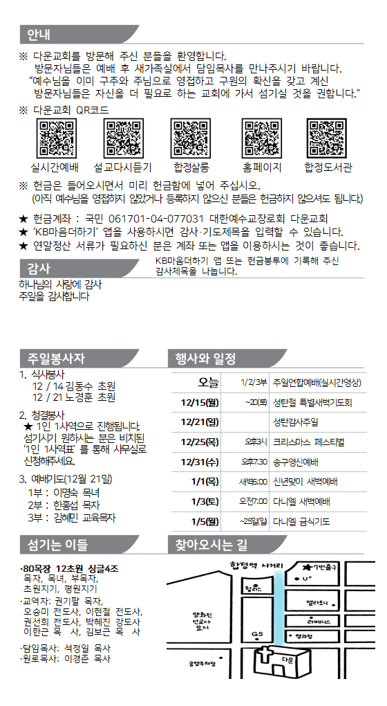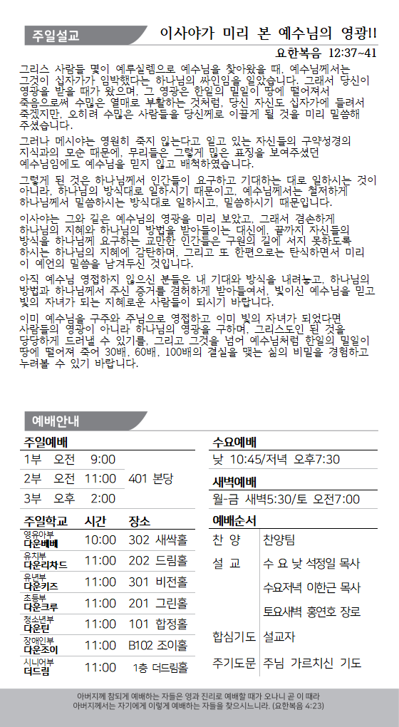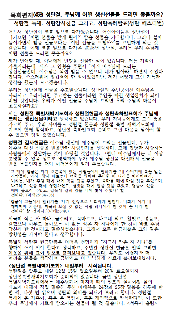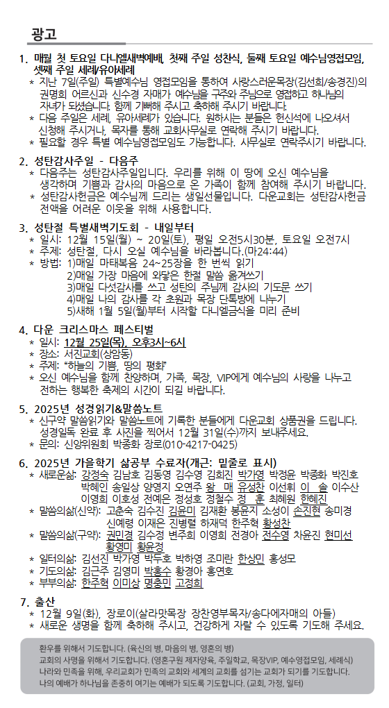 * 다음주는 성탄감사주일입니다. 우리를 위해 이 땅에 오신 예수님을 생각하며 기쁨과 감사의 마음으로 온 가족이 함께 참여해 주시기 바랍니다.