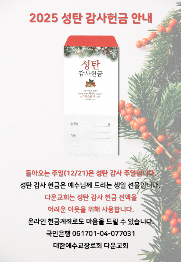 * 성탄감사헌금은 예수님께 드리는 생일선물입니다. 다운교회는 성탄감사헌금 전액을 어려운 이웃을 위해 사용합니다.
