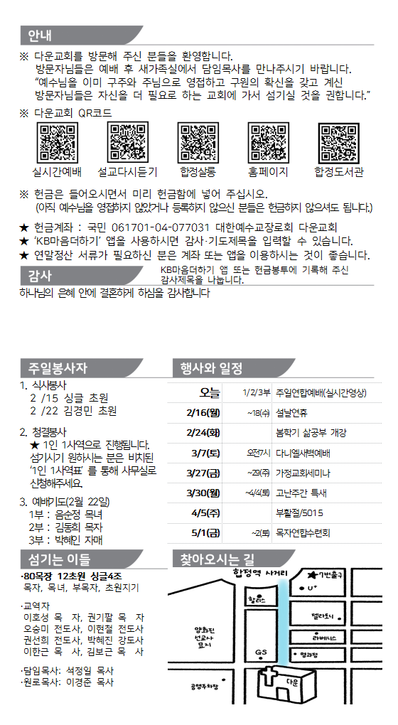 1. 매월 첫 토요일 다니엘새벽예배, 첫째 주일 성찬식, 둘째 토요일 예수님영접모임, 셋째 주일 세례/유아세례
