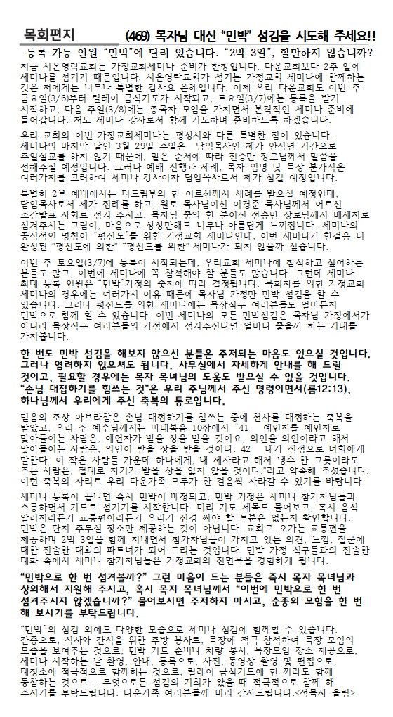 세미나가 한 달 앞으로 다가왔습니다. 릴레이기도와 민박신청에 즐거운 마음으로 동참해 주세요.