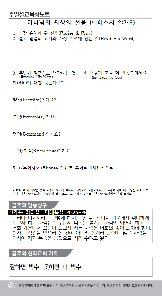 주일설교묵상 용지를 별지로 준비하여 비치해 두었습니다. 주일설교를 한 번 더 듣고 묵상일기를 작성하여 한 주간 살아본 삶의 간증을 목장모임에서 나눠 보시기 바랍니다.